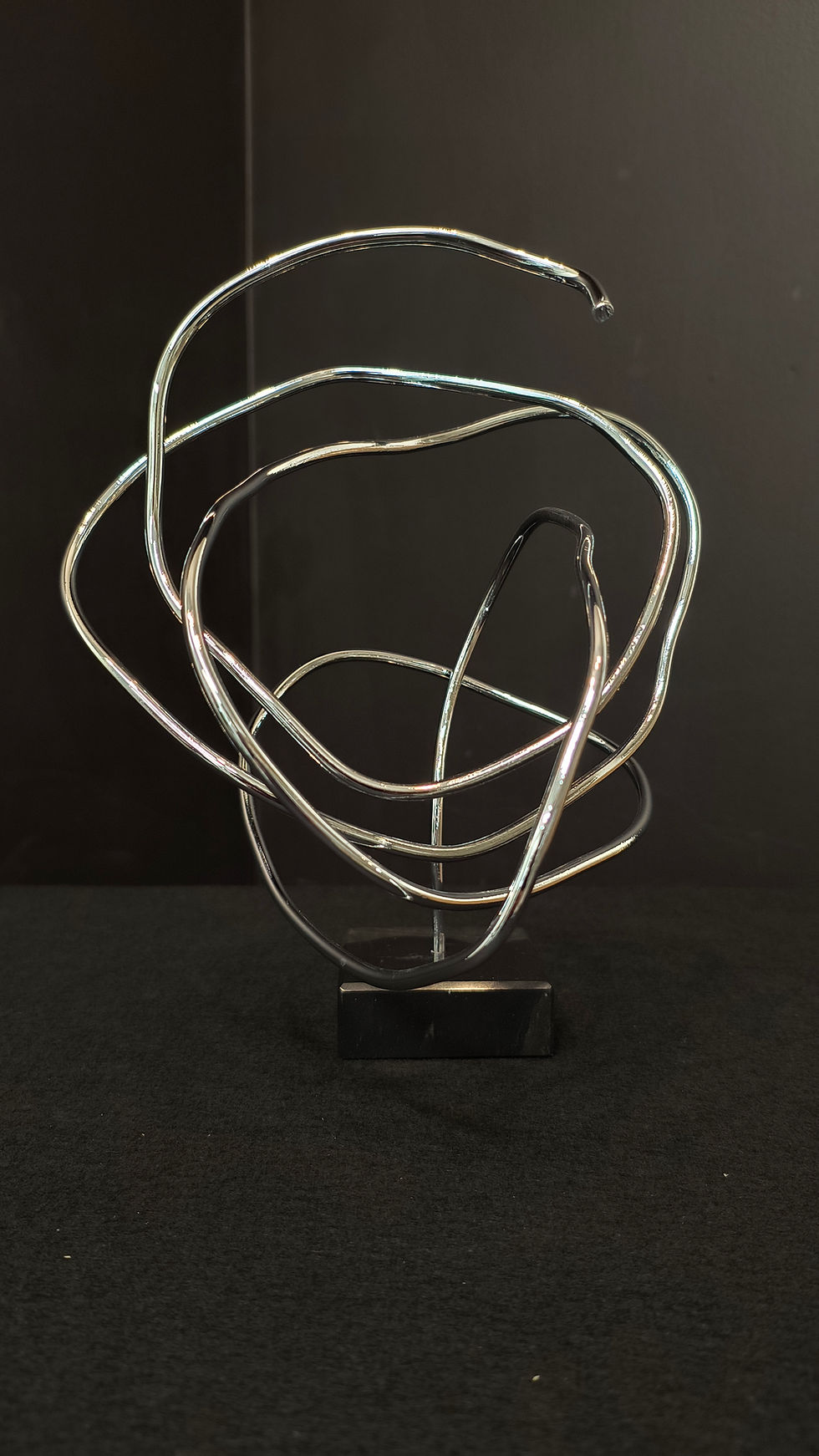 The genesis for this sculpture was my bending soft metal rods to assume various shapes. Eventually a pattern emerged reminding me of two forms spooning together. This led to a 3/4 inch bending square aluminum sculpture reflecting these shapes.